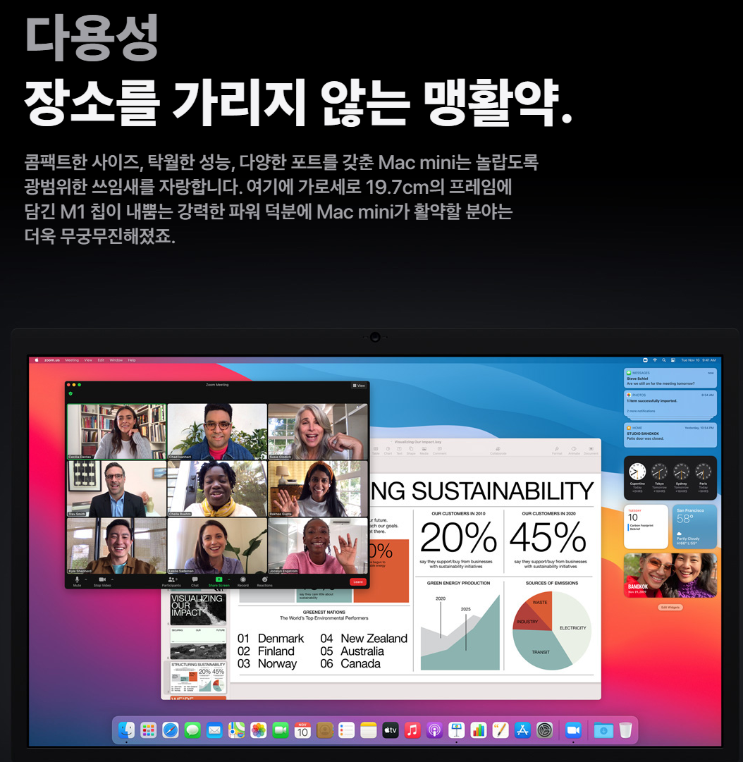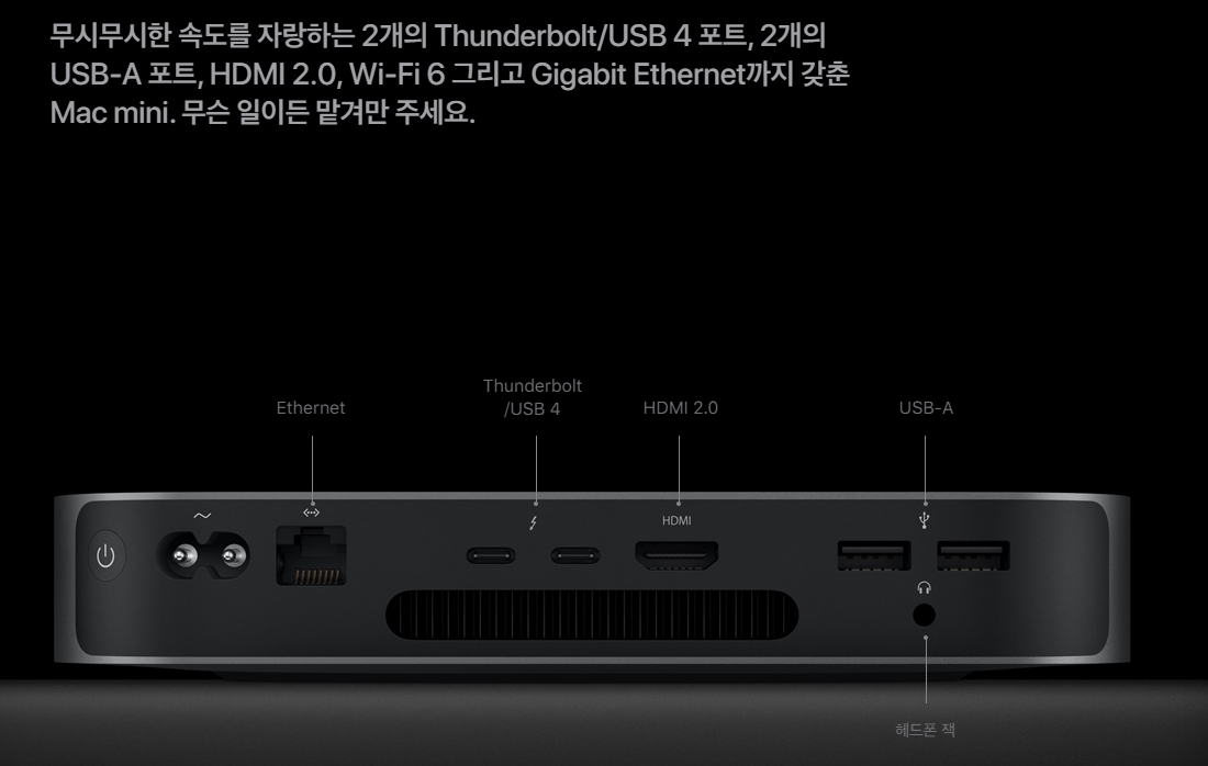 맥미니에 탑재된 M1칩은 트랜지스터가 무려 160억 개나 탑재되어 있다고 합니다. iOS에서 사용하는 A프로세서와 동일한 ARM 아키텍처를 사용하는 데다 GPU와 같은 신경 회로 엔진 등 많은 기술력을 필요로 하는 것들은 단 하나의 칩인 M1으로 모두 통합하였습니다. 그럼에도 고성능 CPU 4 코어에 8 코어 프로세서 등 굉장한 처리속도를 자랑하고, 전력 소모는 낮추었으며 발열도 최소한으로 맞추어 상당히 이상적인 제품으로 탄생하였습니다.
