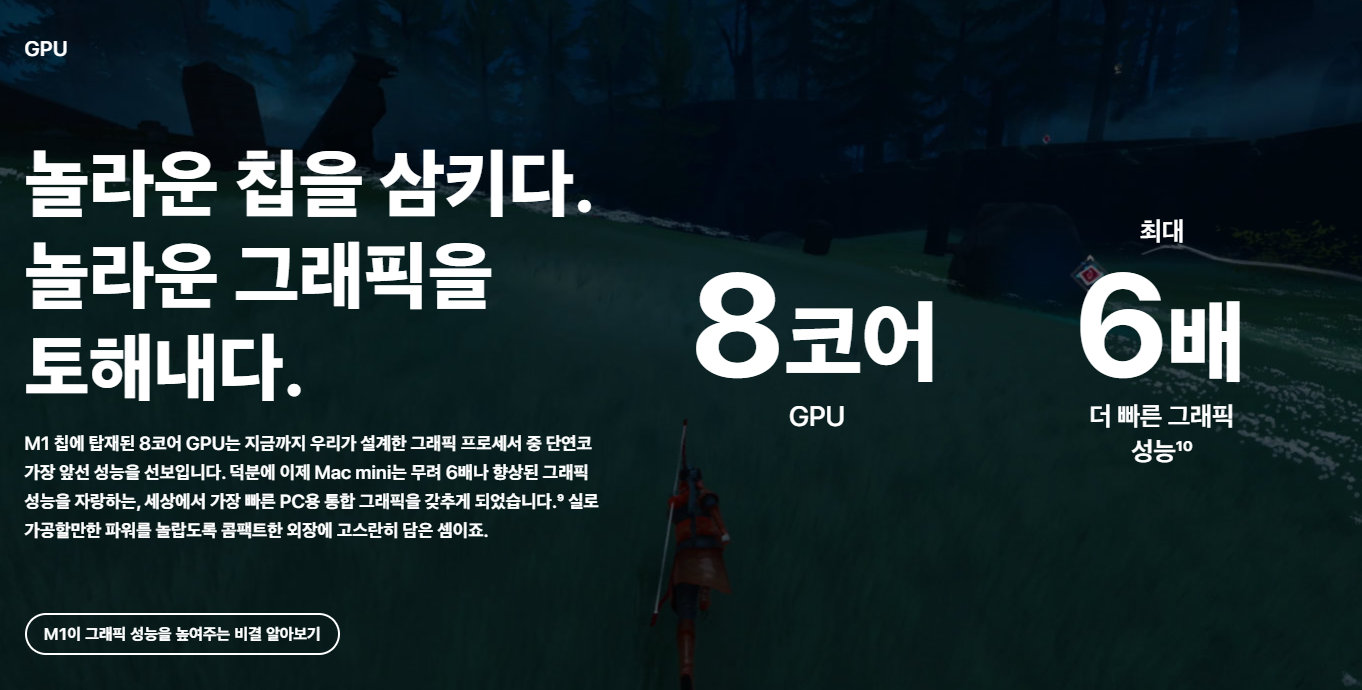 M1칩을 탑재한 맥미니 M1 제품과 맥북 프로 M1 제품에 사람들이 열광하는 이유는 뭘까요? M1칩은 CPU칩과 그래픽카드가 하나로 합쳐진 제품이라 별도의 그래픽카드를 필요로 하지 않는다는 점이 굉장히 매력적입니다.