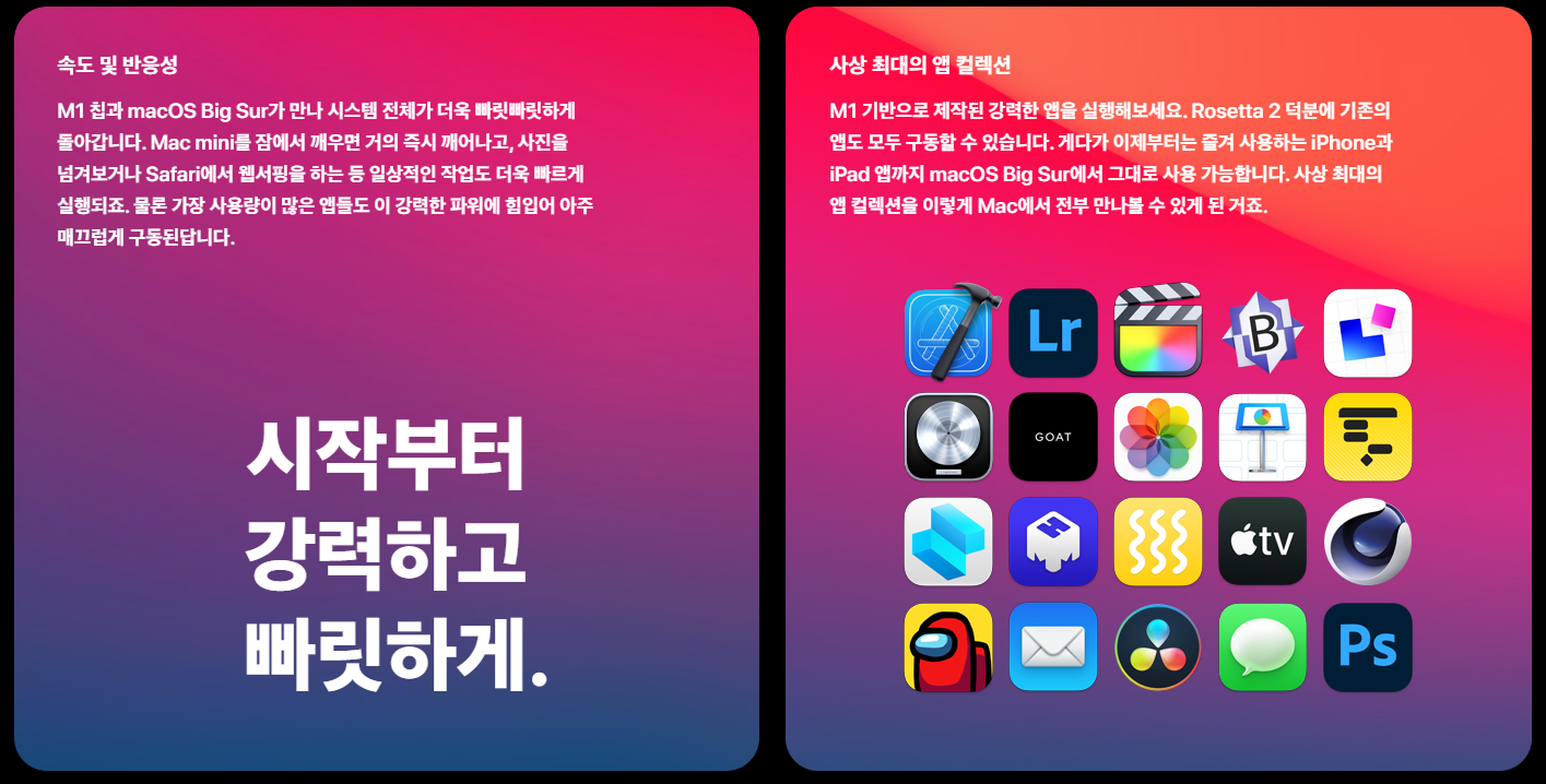 신기술은 직접 겪어봐야 어떤 것인지 알 수 있습니다. 여유가 된다면 M1칩이 탑재된 맥미니로 컴퓨터 맞춰서 사용해보면 좋을 것 같습니다. 여유가 되지 않더라도 워낙 좋은 가성비 때문에 약간 무리를 해서라도 갖고 싶어지는 마음이 드네요.