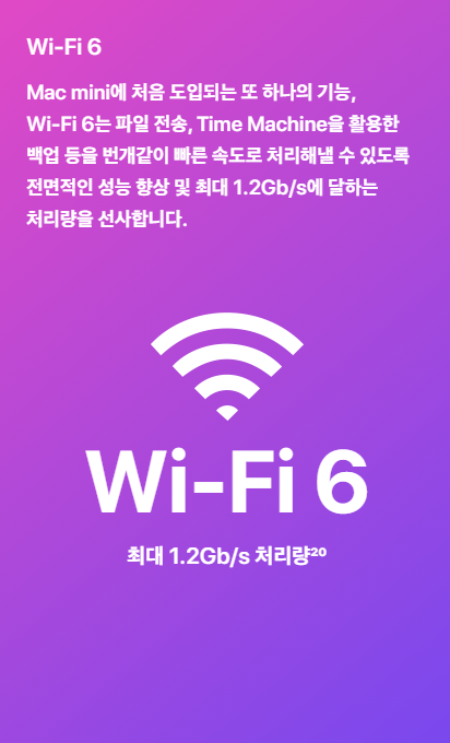최대 15배까지 빨라진 머신러닝까지 가능한 M1칩은 Wi-Fi 6에 대응한다고 합니다. 무선 인터넷 통신속도 역시 굉장히 빠른 속도를 낼 수 있다고 하니 성능 대비 효율이 굉장히 높다고 평가됩니다.